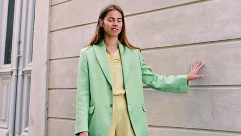 La danesa Trine Kjaer unta su chaqueta verde con un conjunto amarillo vainilla.