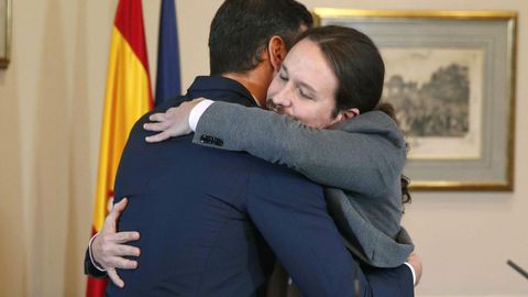 Guarden en el cajón en el que solían archivar los álbumes de fotos la del abrazo de Sánchez e Iglesias porque es un chispazo histórico. Tiene en concreto la textura de esas imágenes que concentran la sustancia de una época como la tuvo la estampa de Felipe y Guerra en el balcón de Ferraz, la de Aznar con los pinreles en la mesa de Bush estamos-trabajando-en-ello, la de Zapatero ante las tropas USA o la del desconcierto de Rajoy abandonando el Congreso tras la voladura inesperada de su presidencia.
