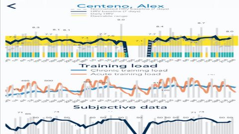 Ahora, se muestra el registro en la aplicación de entrenador. La línea azul marino oscuro representa los valores del parámetro que describe el comportamiento del nervio vago (o rama parasimpática) en forma de media corrida (forma habitual de graficar los datos que suelen sufrir una variación importante día a día). Se definió una franja amarilla, como margen de seguridad, así los valores que estaban fuera de esta franja se consideraban anómalos, y en ese caso se revisaba los parámetros del programa (intensidad, volumen, densidad, frecuencia) y la información sobre bienestar (fatiga, dolor muscular, energía mental, horas y calidad de sueño) para valorar si había que realizar cambios. La franja amarilla se construía con los datos obtenidos del período previo al inicio del entrenamiento, en ausencia de carga física y mental, para que sirvieran como referencia para comparar. Como se puede observar no hubo grandes desviaciones de la franja, solo durante un período donde no se registraron datos por vacaciones. Además la línea azul marino oscuro se acercaba cada vez más al límite superior, sugiriendo una adaptación positiva a nivel de la modulación cardíaca de Alex. Esta información nos indica que podríamos aumentar la carga de trabajo, ya que su capacidad para asimilar el entrenamiento y los estresores de la vida diaria ha aumentado, es decir ha aumentado su nivel de energía.