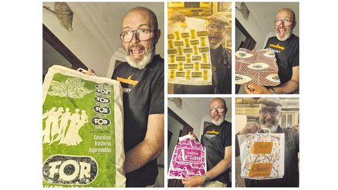 Es un apasionado de la música, el cine, de A Coruña y el pasado. Muchos lo conocen como Lili, y de vez en cuando monta un show con la ayuda de un triciclo antiguo que compró en Suances, Cantabria, y que bautizó como Lilicleta. A partir de ahí hace proyecciones, sesiones de disyóquey y convierte el vehículo en discocleta, cinecleta, o musicleta. Así es Fernando, el coleccionista de bolsas de tiendas de siempre que reconoce que «cuando vi la de Saldos Arias me emocioné». Es una de sus joyas plásticas. La de Chavalín indica todos los lugares donde tenía establecimientos: Vigo, A Coruña, Ourense, Oviedo y Salamanca. Lo mismo ocurre con la de Barros y su inconfundible combinación de colores negro, blanco y amarillo. Junto al logotipo figuran las ciudades gallegas en las que estaban presentes, y otras como León. En la de For, negocio especializado en gabardinas, trincheras e impermeables, aparecen las direcciones de las cinco tiendas que llegaron a regentar en el centro de A Coruña. «Tengo más, como por ejemplo del hipermercado Continente, que así se llamaba antes de convertirse en Carrefour, pero es algo menos vintage. La más antigua posiblemente sea la de electrodomésticos Docampo. También es la que más aprecio», analiza. Seguro que ustedes tienen en casa algunos de estos curiosos tesoros que se conservan muy bien. «Está claro eso que dicen de que los plásticos duran una eternidad. Llegará un momento en que estarán mal vistos, pero yo sigo llevando algunas de esas bolsas cuando hago shows y las regalo a la gente», sentencia Pujalte.