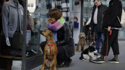 A medida que los perros se van adaptando, se van introduciendo novedades, por ejemplo, llega un punto en que Lorena también les enseña a comportarse en tiendas o en cafeterías, es decir, a adaptarse a la vida urbana. «Cuando vamos a las tiendas nos dividimos en dos grupos. Mientras unos hacen un ejercicio fuera, otros van entrando de uno en uno. Empezamos por tiendas que sean menos ruidosas, evitando las que tienen la música a tope y sería muy estresante para el perro, y entramos y salimos varias veces. Dentro hacemos un ejercicio para que entiendan que no pueden oler las prendas, también trabajamos los ascensores y las escaleras mecánicas para que no tengan miedo...», señala. En las cafeterías intenta que aprendan a estar tranquilo aunque vean a otros perros o personas, «que sepan que tienen que estar relajados mientras tomamos algo». «Si son cachorros, desde el minuto uno hay que acostumbrarlos al coche, a las cafeterías... No se trata de que hagan ejercicios de educación básica, de sentarse y estar quietos, es más de autocontrol, que entiendan que si yo voy a una cafetería, se tiene que quedar debajo de la mesa tranquilo hasta que le digan que nos vamos», apunta Lorena.