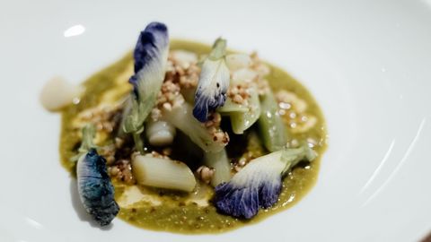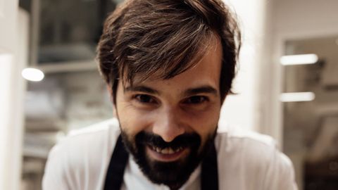 El chef recuerda que «en los primeros días en L'Arpège estaba cortando cebollas, y claro, estaba seccionando el gorrito como a un centímetro, y fíjate qué mala suerte, que llegó Alain Passard, la primera vez que lo conocía, cogió mi cebolla y dijo al resto del equipo: ‘Fijaos lo que está haciendo, bienvenido, aquí te vamos reconducir'». Tras seis años con el maestro francés, su cocina no es vegana, aunque lo podría ser, y bajo los aromas cítricos y herbáceos que inundan el paladar, nos podemos encontrar cualquier exquisitez que proporciona el campo o el mar, eso sí, siempre en temporada. En un espacio muy personal en el que ha intervenido toda la familia y muy cercano al renovado estadio Santiago Bernabeu, en la calle Panamá, prevalece una vistosa bodega al fondo del comedor, aunque también sorprende la importancia de la cocina, pues nada más entrar en el restaurante la encontramos sobre nuestros pies a través de una cristalera.