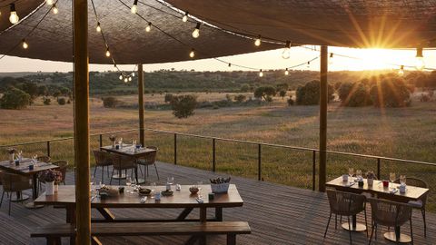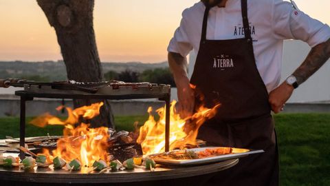 El hotel Octant Évora, ubicado en la Herdade do Perdiganito, acoge al restaurante À Terra. El paisaje se despliega a lo largo de 11 hectáreas de caminos, pasarelas y praderas que se extienden hasta las aguas del embalse de Monte Novo.