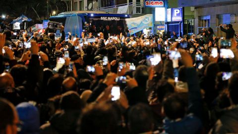 Así recibieron los miles de seguidores fuera de San Paolo al autobús del Nápoles. Las gradas, llenas desde casi una hora antes. El exdelantero del Nápoles de Maradona, el brasileño Careca, dando una vuelta al campo antes del partido para arengar aún más a las masas.