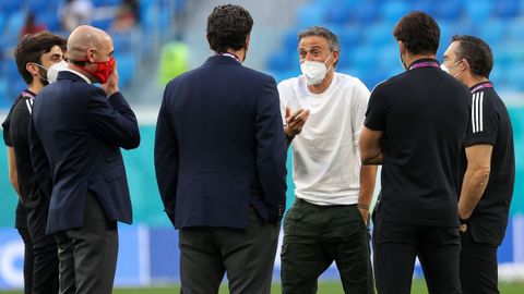 Los futbolistas españoles ya se encuentran sobre el césped del Gazprom Arena. En el verde también está Luis Enrique, que hasta hace minutos bromeaba con miembros de su cuerpo técnico y de la federación española.