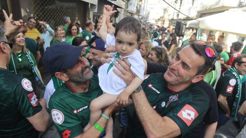 Alberto Rodríguez lleva cuarenta años viendo al Racing. Y le ha transmitido esa pasión a su hijo Pablo Rodríguez, que no ha dudo en teñirse de verde para la ocasión. «Promete el día. ¡Lo tenemos en nuestras manos!», exclama emocionado. Disfruta de la fiesta previa organizada por la hostelería y peñas en un centro de Ferrol colapsado por la marea verde. Su porra: «2-0- Gol de Carlos Vicente y Manu Justo», augura. Si se confirma, irá a la fuente del Cantón. «¡Y me pongo el pelo rubio!», bromea. Reconoce nunca había visto nada igual y espera el mismo ambiente y empuje en el campo, al que irá con sus amigos.