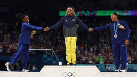 El podio lo completan la brasileña Rebeca Andrade con el oro y la compatriota de Biles, Jordan Chiles, con el bronce tras una reclamación