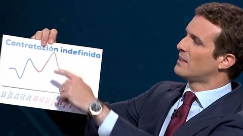 Pablo Casado dibuja un escenario crítico para la economía española desde la llegada de Pedro Sánchez a la Moncloa y saca un gráfico para demostrarlo. El error en su gráfico está en la ausencia de ejes: es imposible conocer así cuánto sube o baja la contratación indefinida.