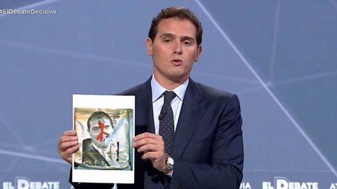 «Sánchez es el candidato del terrorista Otegi», acusa Albert Rivera a Pedro Sánchez. «Qué vergüenza», interrumpe el líder socialista, pero el candidato de Ciudadanos sigue. Ahora saca una foto suya con una pintada y una marca de bala en la frente.