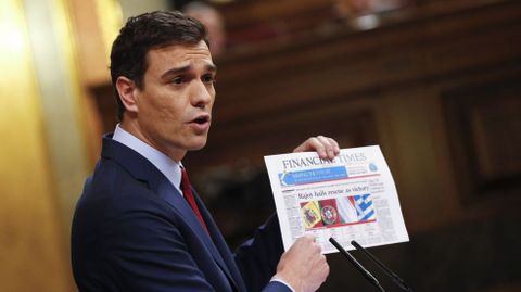Tras presumir esta mañana Rajoy de que España evitó el rescate, Pedro Sánchez tira de hemeroteca y le muestra las portadas, incluso le tradujo una en inglés, para recordarle que España tuvo que pedir un rescate por «su nefasta gestión de Bankia».