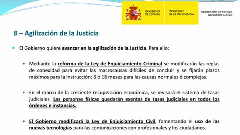 El presidente del Gobierno se dejó algunas cosas en el tintero. Sin entrar en detalles, Rajoy anunció una revisión del sistema de tasas judiciales. Un documento publicado por La Moncloa anuncia además que dentro de este paquete de reformas se incluirá una medida con la que las personas físicas quedarán exentas de tasas judiciales en todos los órdenes e instancias.