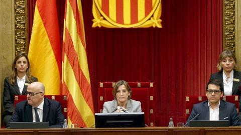 Forcadell abre la sesión parlamentaria pidiendo un minuto de silencio en memoria de las cuatro víctimas por las inundaciones de Lérida. Los 135 diputados de la cámara se ponen en pie.