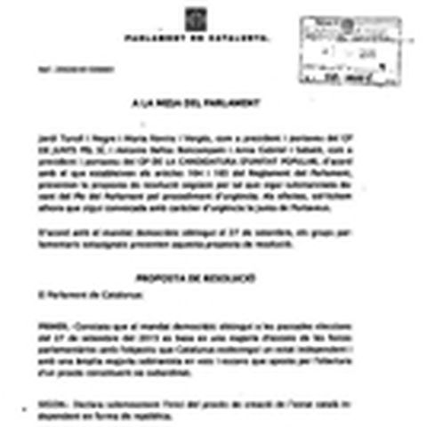 El pasado 27 de octubre, los grupos de Junts pel Sí y la CUP pactaron una propuesta de resolución parlamentaria en la que se declaró el «inicio del proceso de creación del estado catalán independiente en forma de república», sin supeditarse a lo que pudiese decir un Tribunal Constitucional «deslegitimado».