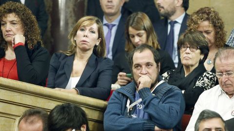 Mientras los diputados de JxSí y la CUP se ponían en pie para aplaudir la aprobación, los populares también se levantaban pero para sujetar las banderas, y con su líder de grupo Xavier García Albiol a la cabeza portando una española, como también ha hecho desde la tribuna de invitados la exlíder parlamentaria, Alícia Sánchez-Camacho.