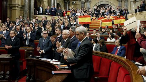Aplausos de los grupos independentistas y simpatizantes que han acudido a la tribuna de invitados. Los diputados del PP han sacado banderas españolas y catalanas tras conocerse los resultados.