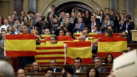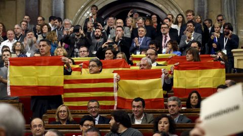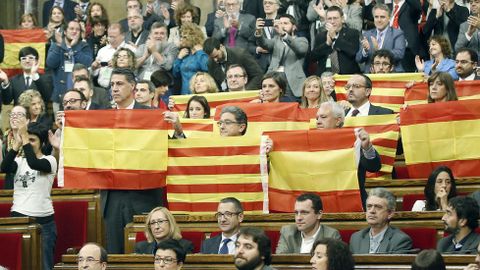 Los diputados del PP en el Parlament se han puesto en pie y han exhibido banderas españolas y catalanas tras aprobarse en el Pleno la resolución de inicio del «proceso de desconexión» con el resto de España.