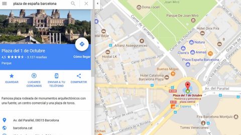 Al teclear «plaza de España, Barcelona» en Google Maps, el servicio cartográfico del gigante de Internet conduce directamente a la ubicación catalana, pero le cambia el nombre: Plaza del 1 de octubre. Probablemente se trate de una gamberrada orquestada por algún hacker.