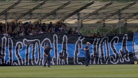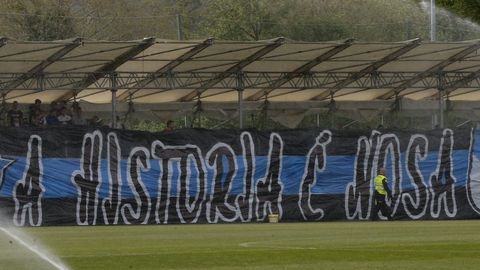 Los dos equipos ya se ejercitan sobre el césped de Abegondo, con la grada principal ya repleta de aficionados.