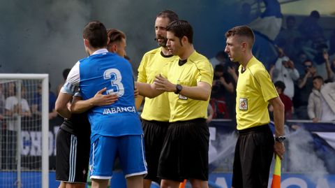 Se enrarece el ambiente en el derbi, dura entrada de Edu Expósito sobre Agus Molina, amarilla para el jugador del Dépor, es la segunda del partido.