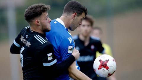 Agarrón clarísimo de Romay sobre Dennis Eckert, amarilla para el mediapunta del Fabril, que pide disculpas al rival. El Celta B tiene el partido muy controlado en Abegondo.