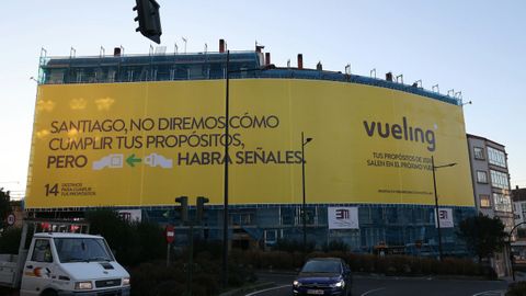 Vueling echa el resto no solo en Lavacolla, donde ya lidera el tráfico aéreo. Desde hace días una publicidad gigante, situada en la rúa do Hórreo, frente a la rotonda de la Galuresa, no pasa desapercibida