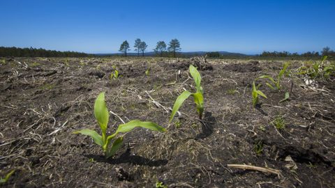 Dos jóvenes aprovechan las tierras quemadas para plantar cereales con los que elaboran la bebida y aprovechan la paja para los techos de los hórreos