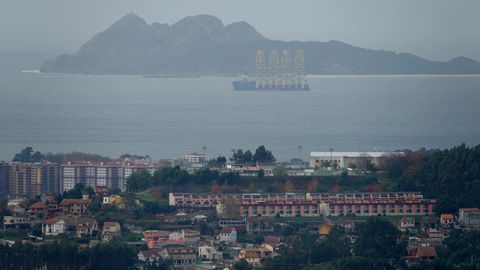 Un buque con cimientos para parques eólicos se abriga en la ría de Vigo