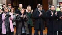 Mas, Ortega y Rigau han llegado al Palacio de Justicia arropados por el presidente Carles Puigdemont -«Hoy muchos nos sentimos juzgados», ha dicho minutos antes- y por los miembros del Govern, así como por las entidades soberanistas, cargos electos y miles de personas