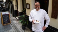 Un hojaldre dulce de sardina fresca a la llama, crema de queso Arzúa Ulloa y mermelada de ruibarbo encurtido es la tapa que propone para disfrutar en la terraza de su restaurante Atípico el cocinero Miguel Vázquez