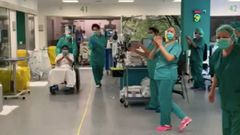 Uno de los dos pacientes que ha sido dado de alta hoy, 3 de abril, de la UCI del Hospital Universitario Central de Asturias, es este joven de 34 años que abandona la unidad de cuidados intensivos visiblemente emocionado