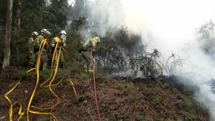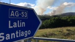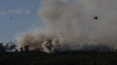 Medios terrestres y aéreos trabajan en la extinción de un incendio en la parroquia de A Corna, en el municipio de Piñor. Entre cada foco apenas hay un kilómetro de distancia. Uno de ellos está controlado.