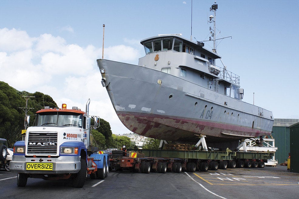 El transporte de barcos por tierra es habitual. Pero cuando el barco en cuestión es de patrulla y alcanza una altura de 30 metros, se ... convierte en algo un poco más complejo. La estabilidad del camión es clave.