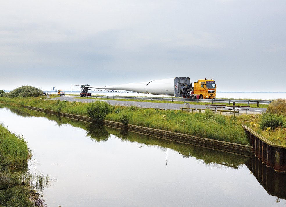 La pala pertenece a una turbina eólica y mide 74 metros de largo. Es un objeto que se traslada con frecuencia, lo que no impide que el de la imagen –en Dinamarca– se llevara por delante en el trayecto once señales de tráfico.