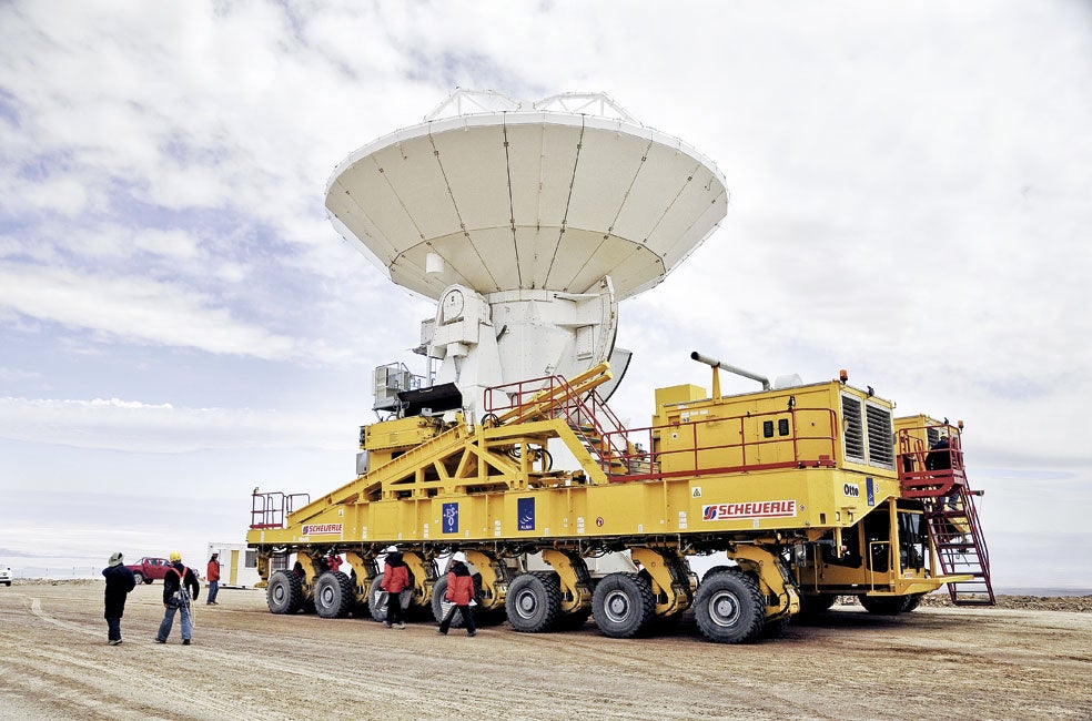 Por si no fuera suficiente el reto de trasladar un delicado radiotelescopio de 12 metros de diámetro, había que hacerlo subiendo 5000 metros de altitud hasta llegar al observatorio Alma de Chile. Construyeron un vehículo de 28 ruedas específicamente para ello.