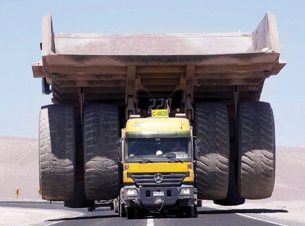 Aunque da la impresión de que el camión amarillo se ha incrustado en el Caterpillar 797, un coloso del transporte para minería que pesa 230 toneladas, en realidad lo traslada con razonable comodidad, aunque obstaculice todo el tráfico.