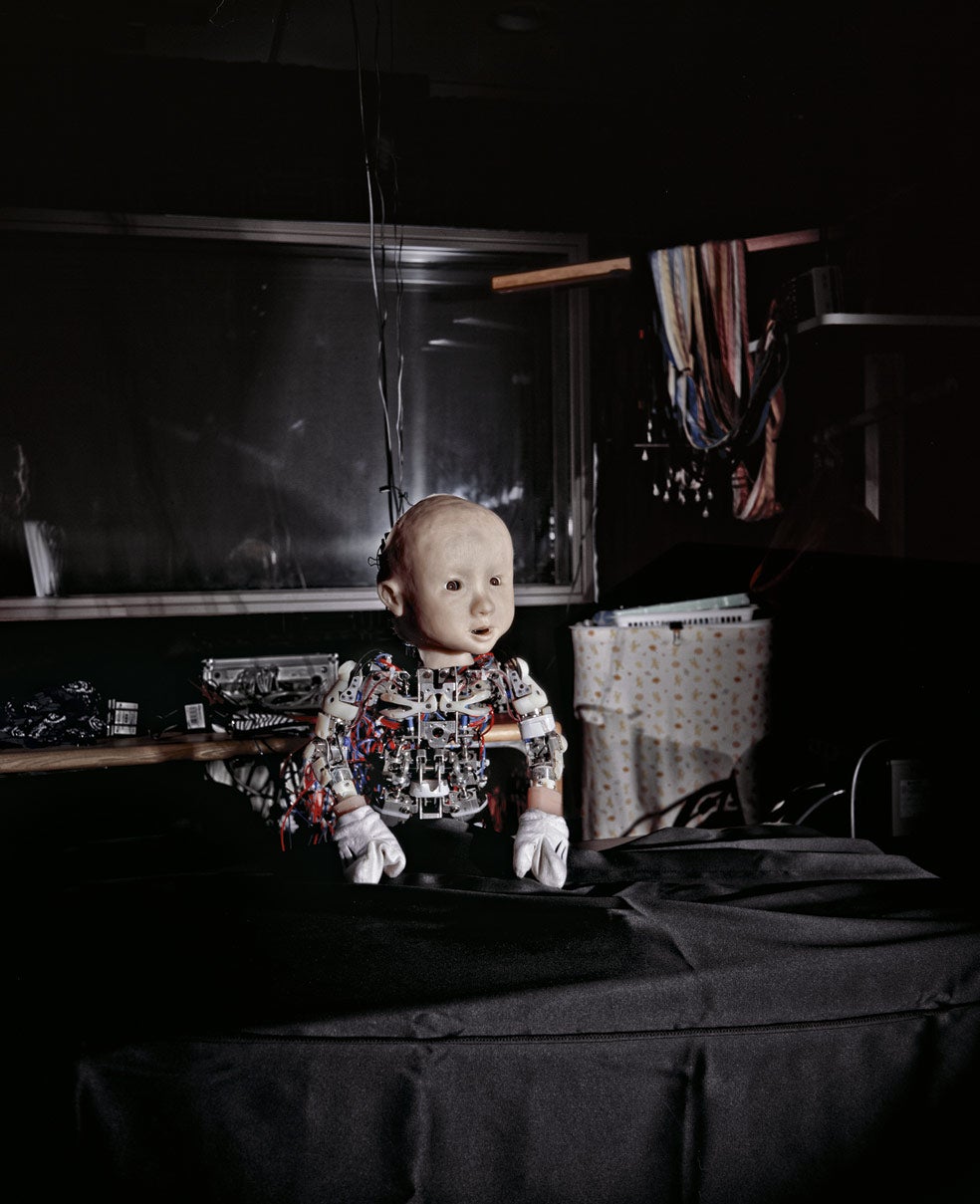 Affeto habla como un bebé y muestra expresiones faciales propias de edades muy tempranas. Creado por el Laboratorio Saitama, en Japón, para investigar nuestro desarrollo cognitivo, se utiliza también para entrenar a cuidadores infantiles. La imagen forma parte del libro Humanoid, de Max Aguilera-Hellweg.