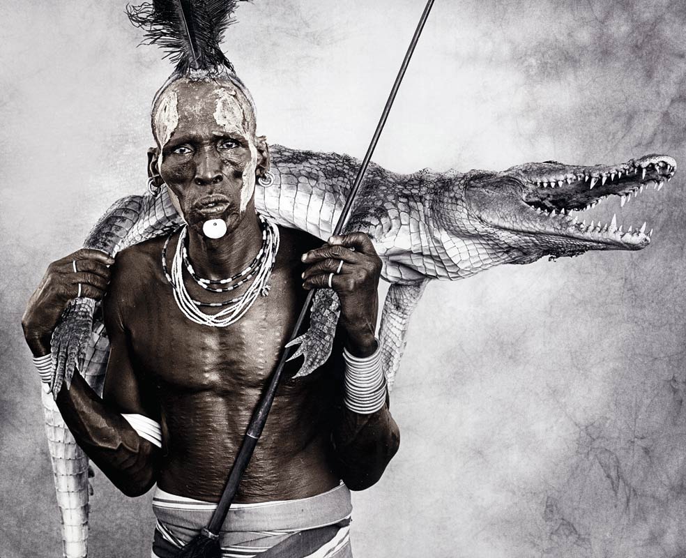 Biwa tiene 44 años y posa con un pequeño lagarto sobre sus hombros. Pertenece a los karos, una pequeña tribu etíope de apenas 1500 ... individuos considerados los maestros de la pintura corporal y las escarificaciones —cicatrices decorativas—, que pueden representar tanto el fallecimiento de un rival como la muerte de un peligroso animal. Es la etnia con más riesgo de desaparecer: una nueva y larga sequía, con su consiguiente hambruna, o una guerra con sus enemigos, los mursis, la pueden condenar a la extinción.