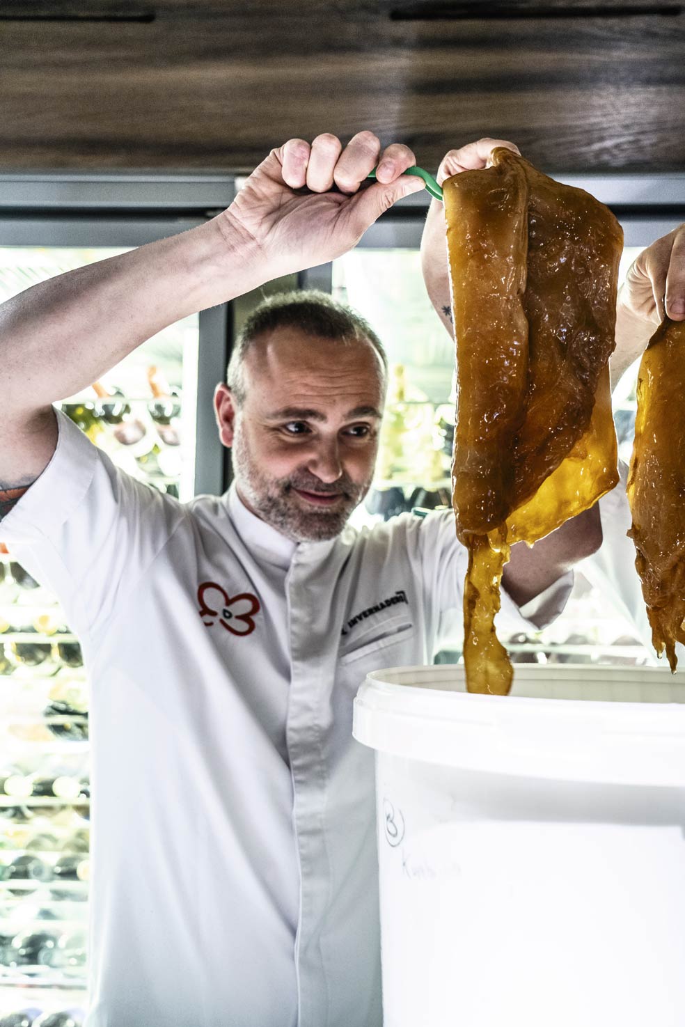 Rodrigo de la Calle muestra orgulloso la masa madre de kombucha que atesora desde 2015. «Es una cosa amorfa», dice riendo. Se la trajo de un pequeño pueblo de Guatemala. «En una minitienda había una especie de medusa en un bote. Me explicó que era kombucha y me traje el hongo». Y, de nuevo, el chef y su equipo se ponen a investigar posibilidades.