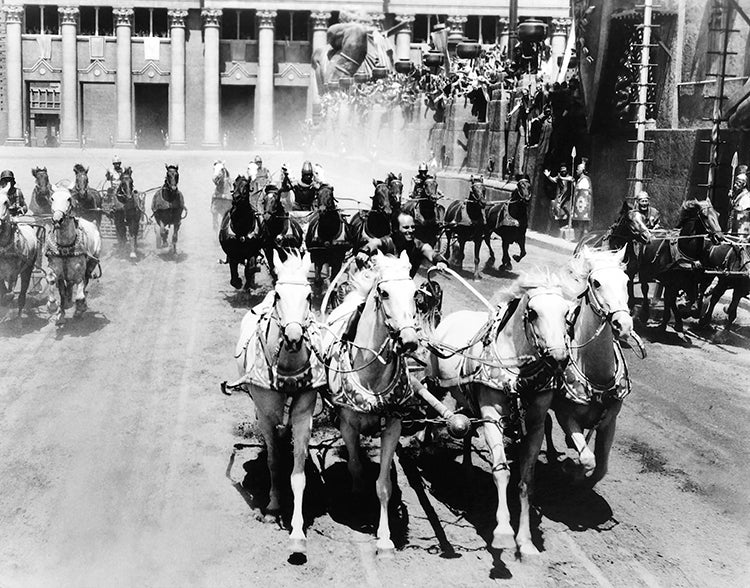 Detrás del gran realismo de la carrera de cuadrigas hay una medida planificación y, sobre todo, cuatro meses de preparación intensa tanto de los caballos como de los aurigas. Charlton Heston, actor conocido por su compromiso en los rodajes, no faltó un sólo día a los entrenamientos, dirigidos por Yakima Canutt, doble de mitos como Clark Gable y, sobre todo, John Wayne (Canutt es quien salta sobre los caballos del carruaje perseguido por los apaches en La diligencia de John Ford). A él deben Heston, ya un experimentado jinete, y Stephen Boyd (en el papel de Messala) esa destreza a las bridas propia de auténticos aurigas romanos que exhiben en Ben-Hur. Ambos, de hecho, filmaron casi toda la secuencia sin dobles, salvo el instante en que Heston casi sale despedido de su carlinga tras atropellar a uno de sus rivales. Además de actores y especialistas, en el rodaje de la carrera intervinieron 80 caballos andaluces y lipizzanos, traídos de Yugoslavia y Sicilia; se utilizaron 18 cuadrigas, con un peso de 420 kilogramos cada una; y las cámaras Panavision de 65 mm (se emplearon seis, rodando muchas veces al unísono), que permitieron planos como el de la foto, iban montadas sobre veloces coches deportivos.