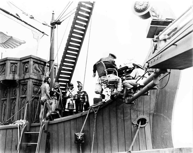 La gran batalla naval entre los romanos y los piratas macedonios, punto de inflexión en la trayectoria del protagonista, fue el otro gran reto fílmico de la producción. En lugar de rodar en mar abierto, como se hizo en la versión de 1925 con tremendos problemas logísticos, se creo una laguna artificial en la que se introdujeron dos trirremes (barcos con una vela y tres bancos de remeros superpuestos en cada flanco) a tamaño natural en cuyas bodegas remaban a golpes de latigo y tambor el propio Heston y otros 300 galeotes. Ambas naves protagonizan las salvajes embestidas de los barcos en la pantalla. Para los planos generales de la contienda, por su parte, se creo una auténtica flota a tamaño reducido colocada dentro de un gran tanque donde los barcos eran movidos mediante un mecanismo de raíles submarinos. La secuencia, además, incluye algunas de las frases más memorables de la película: «Te mantenemos con vida para que sirvas a este barco. Rema bien y vivirás» y, sobre todo: «Tus ojos están llenos de odio, número 41. Eso es bueno. El odio mantiene vivo a un hombre».