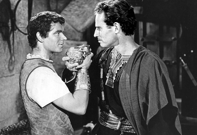 Ben-Hur y Messala, amigos de infancia, se reeencuentran en su madurez. «Después de tantos años, todavía cerca», «te dije que volvería», «no creí que lo hicieras, estoy tan feliz», son las frases que se cruzan antes de brindar con los brazos entrelazados y mirándose a los ojos. Esta es la escena clave de la película, la que presenta la relación entre protagonista y antagonista al tiempo que dispara el conflicto. ¿Cómo se construyó? El escritor y guionista Gore Vidal recibió el encargo de adecentar el guion de Ben-Hur, descrito por él mismo como «un pedazo de basura». Le faltaban dos años de contrato con MGM y lo hizo a cambio de la carta de libertad. Desesperado tras haber escrito diez versiones, le hizo entonces una inesperada propuesta a William Wyler. «Willie, intentemos una cosa con estos dos chicos: convirtamos esto en una pelea entre amantes». «¡Gore, por favor, que esto es Ben-Hur!», replicó el director. «Lo sé, pero si no incluyes una motivación más emocional a la relación entre ambos, ni siquiera tendrás Ben-Hur. Será muy sutil, no habrá una sola línea explícita, pero la venganza de Messala solo puede estar motivada por el sentimiento de rechazo que sentiría un amante». Su plan era sugerir a Stephen Boyd que interpretara el papel desde ese ángulo, pero sin que Heston lo supiera. «No se lo digas a Chuck porque se vendrá abajo», añadió Wyler, según Vidal. Así que, durante el rodaje, todo el mundo lo sabía menos él. Wyler, sin embargo, rechazó esta versión de los hechos: «No recuerdo haber tenido semejante conversación», se limitó a decir. Heston, por su parte, se puso hecho una furia: «Es un insulto para William Wyler y me irrita enormemente. Además, Vidal apenas trabajó tres días en la película y sus propuestas fueron descartadas». Años después, sin embargo, en su autobiografía, Heston escribió: «Hoy hemos ensayado la crucial escena con Messala, reescrita por Vidal. Esta versión es mucho mejor que la que había en el guion».