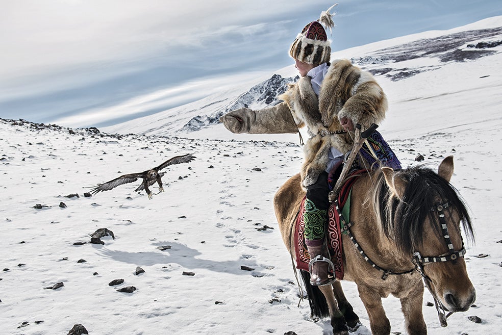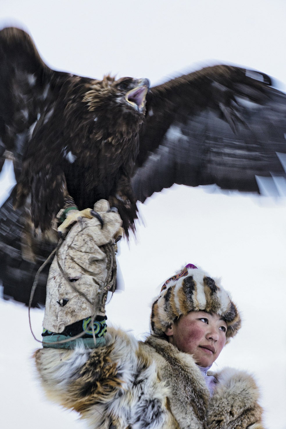 Asker llama a su águila con un grito peculiar –propio de cada cetrero–. El animal acude, aunque se encuentre a más de 200 metros de distancia, y se posa sobre el guante de la niña. El golpe es tan fuerte que a veces el ave la tira del caballo.