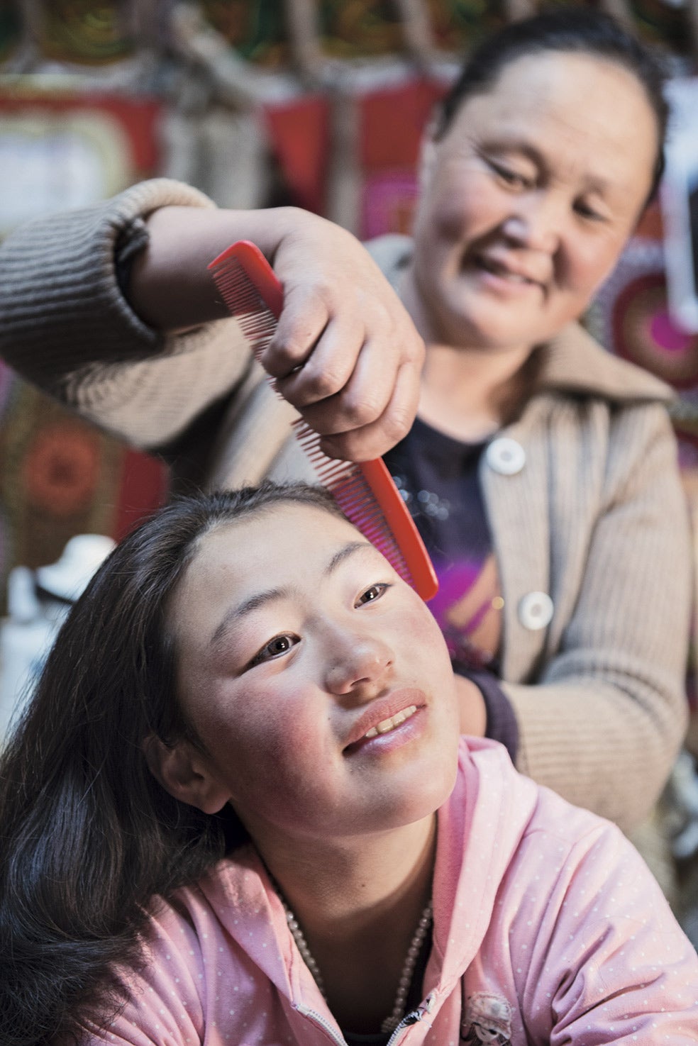 La familia de Asker vive en una yurta tradicional, una tienda de campaña circular. Su madre le hace las trenzas todas las mañanas. Las mujeres nómadas soportan todo el peso del hogar: mientras sus maridos llevan el ganado a pastar, ellas elaboran quesos, cocinan...