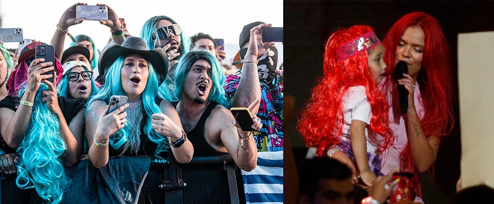 En este contexto, artistas de la talla de Karol G han llevado esta tendencia al siguiente nivel al pedir a sus fanáticos que acudieran a los conciertos con «traje de baño, fiesta, colores, brilloteo y tennis». Varios seguidores en el festival de Coachella del año pasado incluso se animaban a lucir pelucas en uno de los muchos colores que acostumbra a lucir la cantante: azul, rosa, rojo... Tranquilos, según un famoso estilista en redes sociales, todos estos cambios de coloración los consigue a través de pelucas, un imprescindible para sus shows. Algo que también imitan hasta sus admiradoras más pequeñas (a la derecha). «No se volvió a sacar la peluca, ni para ir al colegio», contaba la madre de la niña.