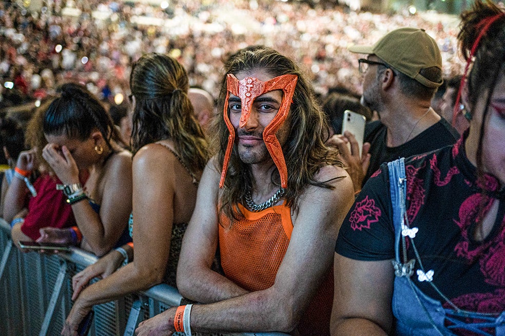 Ahora, el concepto 'Motomami' va mucho más. Los conciertos de Rosalía se han convertido en desfiles de moda donde los seguidores se enfundan en sus cazadoras de cuero, gafas de sol de los 2000 y una estética oriental en los colores rojo y negro. Unos vestuarios milimétricamente cuidados en los que incluso muchos de ellos –como el seguidor de la fotografía– se animan a recrear máscaras con el símbolo de motomami. La catalana ha conseguido crear un estilo propio, que sin necesidad de pedir 'dress code' a los fanáticos, ya es algo frecuente encontrar en cada uno de sus espectáculos.