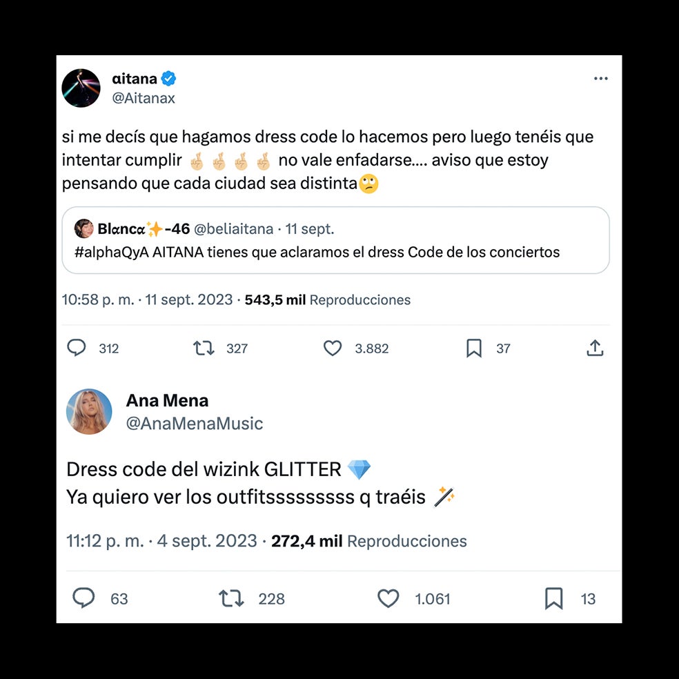 En el ámbito pop español, Ana Mena también se ha sumado a esta tendencia. En su último concierto en el WiZink Center, consiguió que sus fans creasen una mar de glitter. Ella misma lo pedía días antes a través de sus redes sociales. Algo que también ha contagiado al ejército de seguidores de Aitana en vísperas a su gira Alpha Tour. Estos le preguntaban por el 'dress code' vía Twitter y ella finalmente ha publicado la guía de colores para cada ciudad que va a visitar.