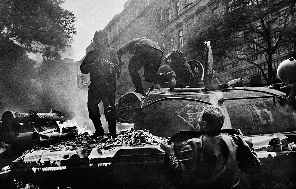 «David contra Goliat. Individuos contra el poder. Este tipo de fotos funcionan porque son símbolos. En palabras del propio Koudelka, muestran a una persona que tiene un arma y a otra que no la tiene y la que no la empuña es, en realidad, la más fuerte. Cuando en agosto de 1968 la URSS invadió Checoslovaquia, Koudelka, un ingeniero y fotógrafo aficionado, salió a la calle a hacer fotos. Se jugaba la vida, pero ni lo dudó. No era reportero, no pensaba publicarlas; lo hizo porque le importaba. Estas fotos no pudieron sacarse de Praga hasta casi un año después, a través del amigo de un fotógrafo de Magnum. Dieron la vuelta al mundo. Usamos un pseudónimo, PP (Prague Photographer), por su seguridad. Aunque él salió de Checoslovaquia en 1970, hasta que murió su padre, en 1984, no reconoció que era el autor de estas fotos»