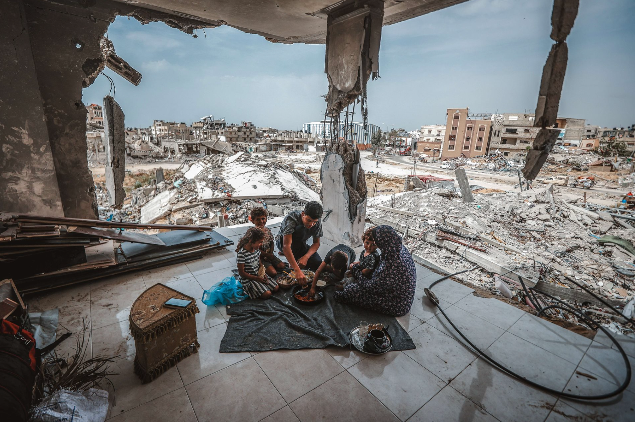 Más del 60 por ciento de las viviendas y el 95 por ciento de los hospitales de Gaza han sido destruidos durante los constantes bombardeos israelíes. Dos millones de personas han sido desplazadas. No hay comida ni agua potable ni medicinas. Pese a ello, familias como la de la foto se esfuerzan por recuperar sus hogares. El trabajo de Ali Jadallah, el autor de la imagen, ha sido reconocido este año con uno de los premios World Press Photo. Solo los fotógrafos palestinos han seguido trabajando en la región bajo las bombas.
