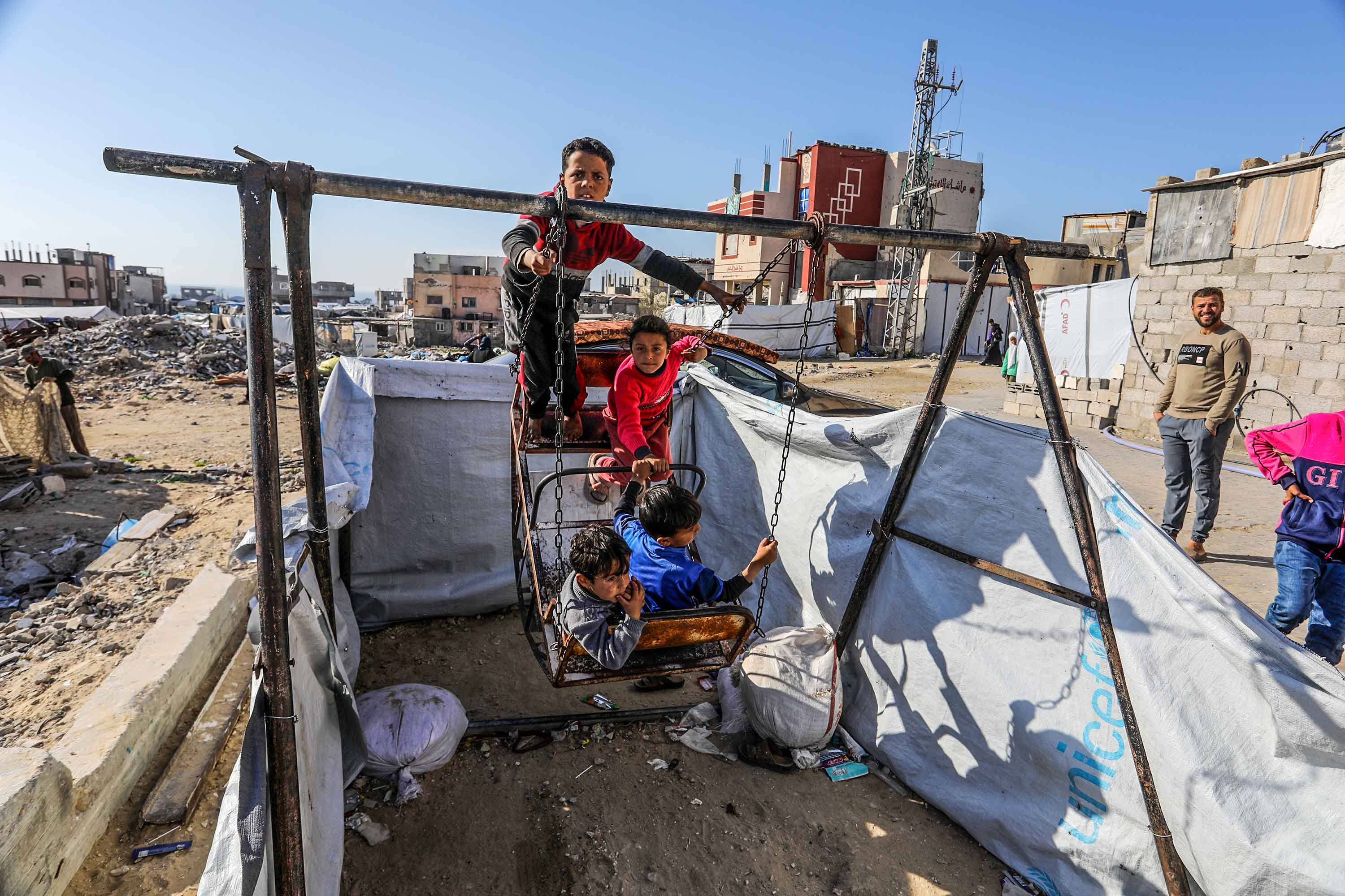 El número de muertos en Gaza, según Naciones Unidas, supera los 50.000; casi 20 mil son niños. El bombardeo del 18 de marzo, «solo el comienzo», según dijo Netanyahu tras violar el alto el fuego acordado, causó la muerte de 400 palestinos, la mitad mujeres y niños. Los de la foto, de Jan Kunis, pueden estar entre ellos. Unos días antes, el 10 de marzo, habían rescatado un balancín de entre las ruinas, mientras sobrevivían como podían en las calles.