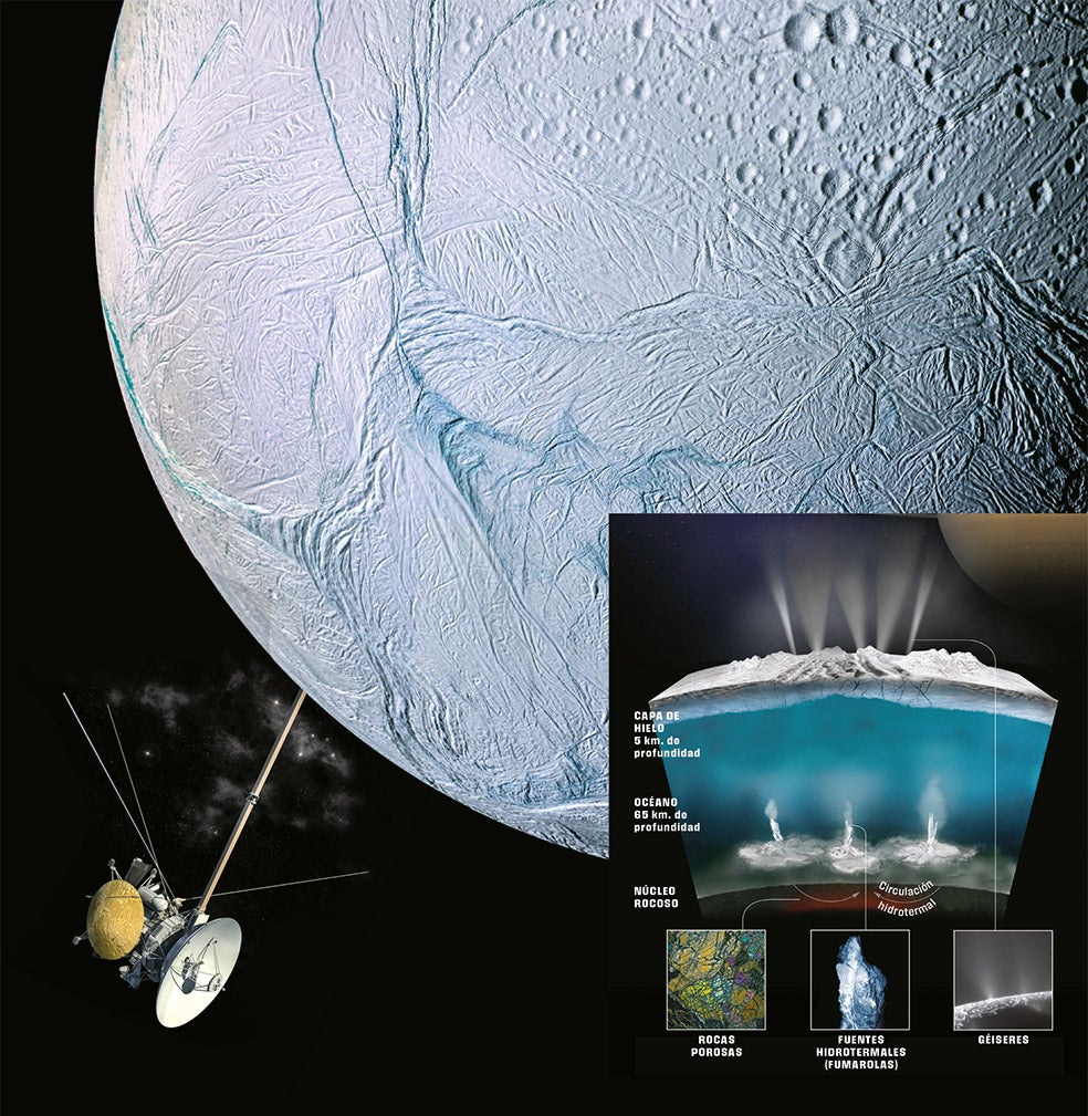 ¿LA CIUDAD PERDIDA DE SATURNO? Bajo una gruesa capa de hielo, los científicos descubrieron un océano de aguas templadas, emisiones de metano (en la Tierra, los yacimientos de este gas natural indican la presencia de fósiles de animales), fumarolas de vapor que escapan de las grietas y cristalizan en el aire... Hay dos grandes hipótesis sobre el origen de la vida: una es que se originó en las fumarolas, fuentes hidrotermales o géiseres, de un océano (abiogénesis); la otra, que llegó a la Tierra en un asteroide o meteorito (panspermia). Lo hallado en Encélado impulsa la teoría de las fumarolas, donde se han detectado cianobacterias y fluidos supercríticos que pueden ser la olla de 'sopa primordial'. Hay varias en la Tierra, pero la más evocadora es La Ciudad Perdida, en el Atlántico Medio, a unas 2300 millas náuticas al este de Florida (Estados Unidos).